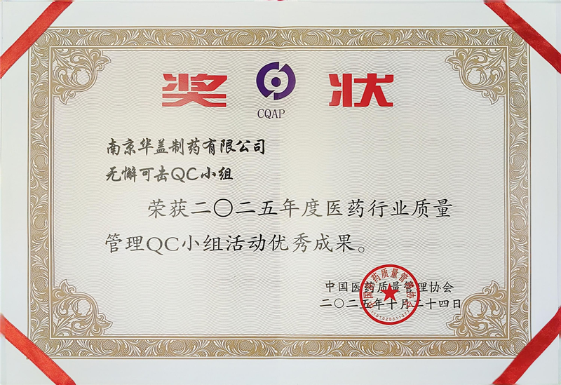 南京华盖制药荣获2025年度全国医药行业质量管理QC小组优秀成果奖